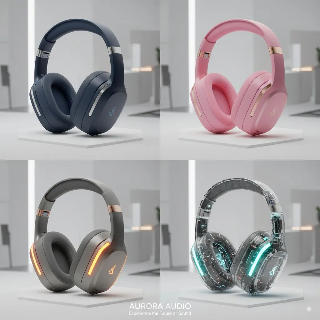 prompt = ("Make 4 variations of this Bluetooth headset: black, pink, gray with orange ear caps, and gray with blue glint – all with the same lighting, same camera angle, and in a white room.")