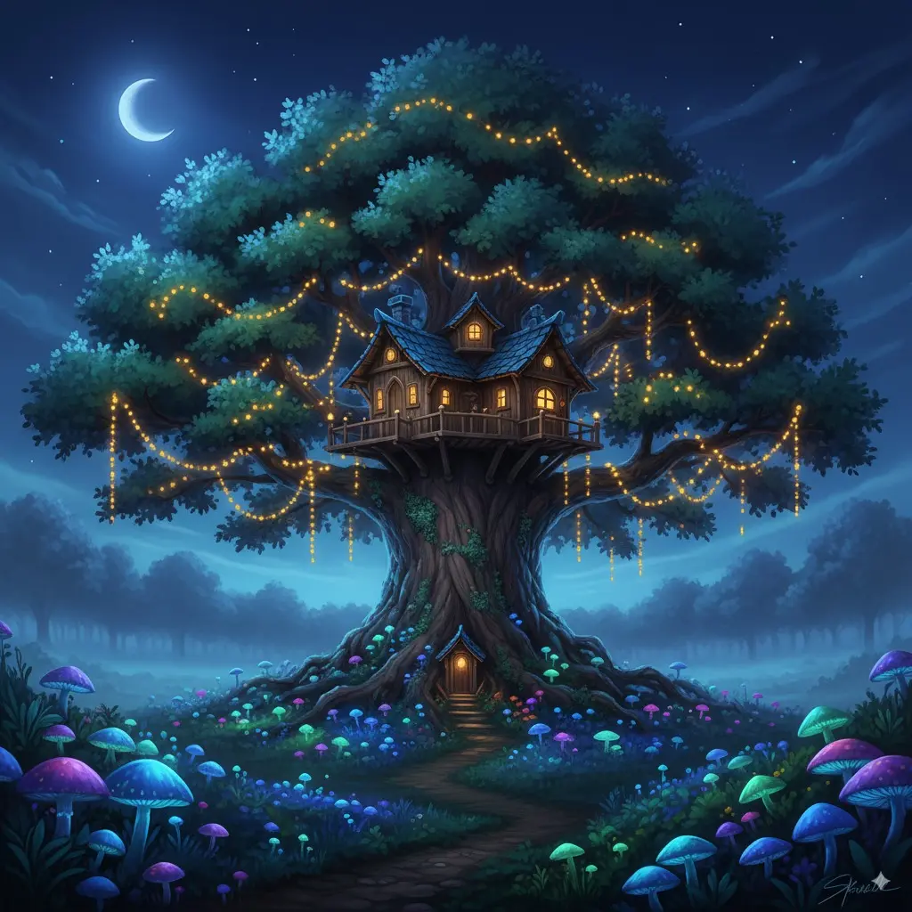 There is a tree house in the forest at night with colorful lights hanging on the trees