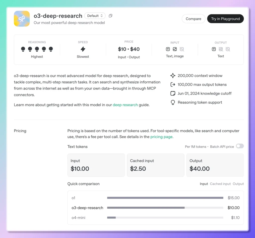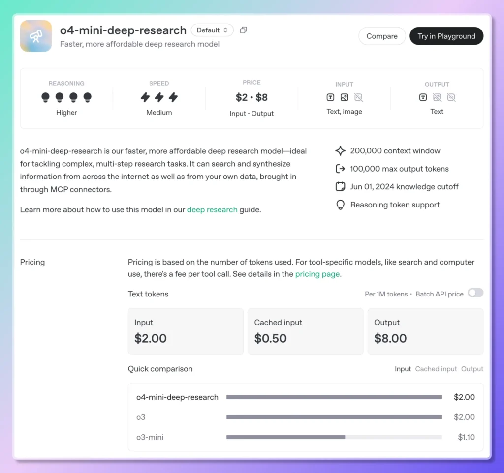 بالإضافة إلى فتح هذه النكهات المتخصصة من البحث العميق من o3 و o4-mini، قامت OpenAI أيضًا بتعزيز نماذج التفكير السائدة الخاصة بها -o3, o3-proو o4-ميني—مع إمكانيات بحث ويب مدمجة. يتيح هذا التكامل للنماذج إجراء عمليات بحث مباشرة، واسترجاع معلومات دقيقة، وتجميع النتائج مباشرةً في مكالمة واحدة. تبدأ أسعار خدمة "بحث الويب الاستدلالي" الجديدة من 10 دولارات لكل 1,000 مكالمة، مما يعكس الحوسبة المتميزة وتنسيق واجهة برمجة التطبيقات المطلوبة؛ وفي الوقت نفسه، خفضت OpenAI تكلفة البحث على الويب على نماذجها المتعددة الوسائط الرائدة (GPT-4o وGPT-4.1) إلى 25 دولارات لكل 1,000 مكالمة .