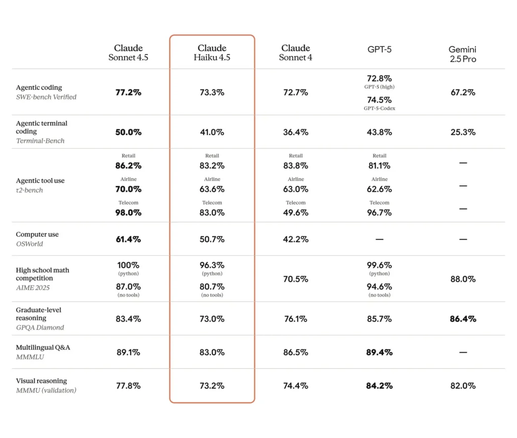 SWE-Bench (coding): Haiku 4.5 scored ~73.3% on SWE-Bench Verified — a result Anthropic highlights as placing Haiku 4.5 among the world’s best coding models for its class.