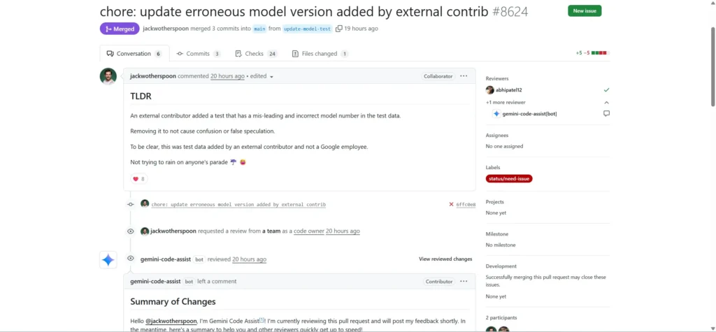 Los mantenedores del repositorio abrieron y fusionaron una breve solicitud de extracción que eliminado o corregido La entrada de prueba engañosa. La explicación del responsable en el PR fusionado es explícita: gemini-3.0-ultra La cuerda era datos de prueba añadidos por un colaborador externoEra engañoso y la solicitud de registro lo reemplazó con el identificador de modelo existente correcto (para las pruebas). El autor de la solicitud de registro y los colaboradores del repositorio enfatizaron que la entrada no era un identificador de producto oficial de Google. En resumen: la apariencia del repositorio era... Un valor de prueba erróneo, no una fuga de producto.