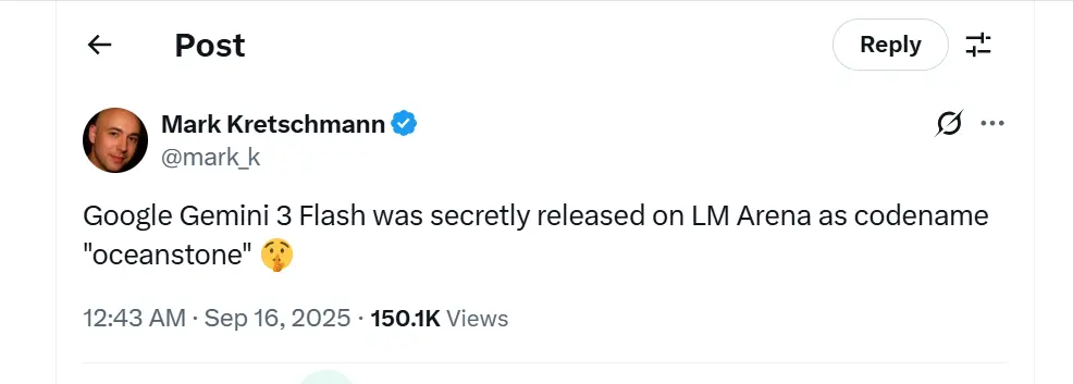 gemini-3.0-ultraen un archivo de prueba. Ese fragmento fue descubierto por miembros de la comunidad y republicado en redes sociales; muchos lo interpretaron como una filtración o una prueba temprana de la existencia de «Gemini 3.0 Ultra». - Los usuarios que navegaban por las listas de modelos de LM Arena notaron un nuevo nombre/nombre en código de modelo “piedra oceánica” Apareciendo en algunas arenas, algunos participantes sugirieron que podría ser una prueba sigilosa del "Gemini 3 Flash". Estos avistamientos alimentaron la idea de que Google estaba probando discretamente una próxima variante del Gemini 3.