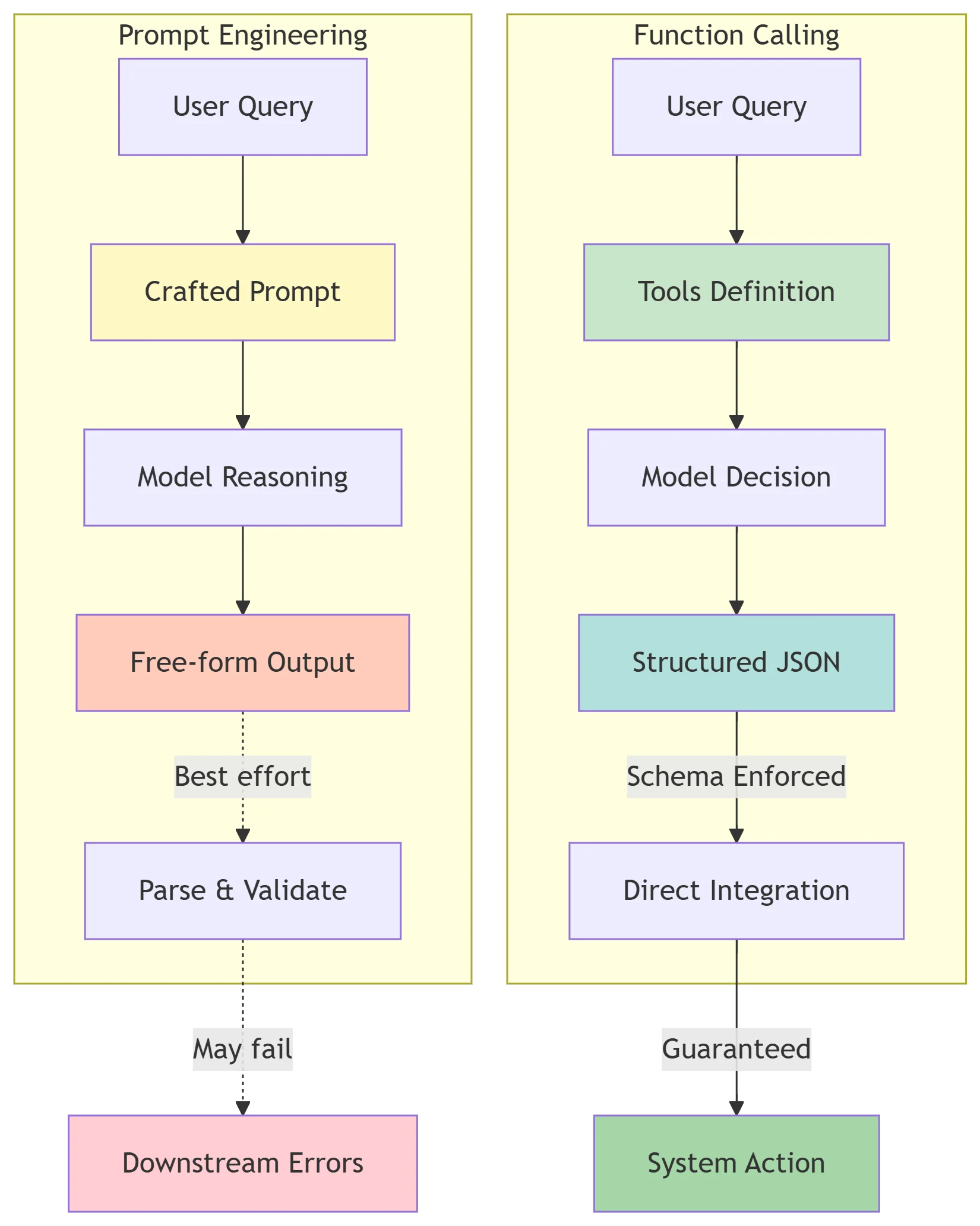 | vs. Prompt Engineering | Function calling enforces output structure at the API level; prompt engineering shapes internal reasoning |