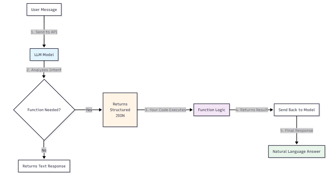 You pass a user's message to GPT API, and instead of a natural-language answer, the model hands you back a structured JSON object telling you exactly which function to call and with what arguments. That's function calling — and it changes the kind of applications you can build with LLMs.