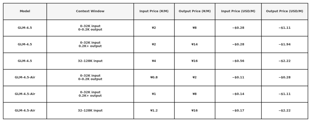 On the CometAPI, the Series is bundled with slightly different tiered pricing,refer to GLM‑4.5 API: