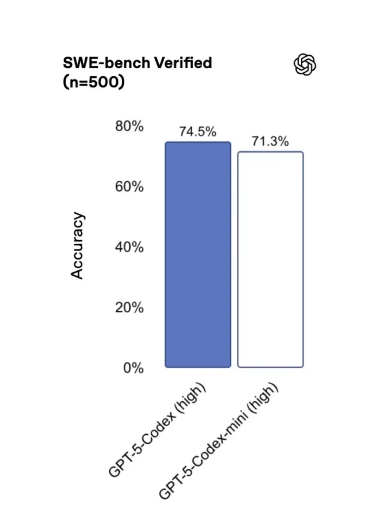 GPT-5-Codex-Mini compared to the original version, its performance is slightly reduced, but developers receive approximately four times the usage credit. In the SWE-bench Verified test, GPT-5 High scored 72.8%, GPT-5-Codex scored 74.5%, and GPT-5-Codex-Mini scored 71.3%.