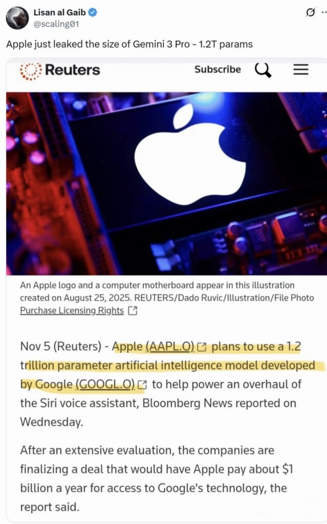 Apple and Google negotiating deeper Gemini integration for Apple Intelligence/Siri — scoop describes Apple planning to use a custom Gemini variant in its AI stack. Apple and Google mentioned the 1.2T parameter in their collaborative plan for artificial intelligence models, which may be the specification of Gemini 3.0.