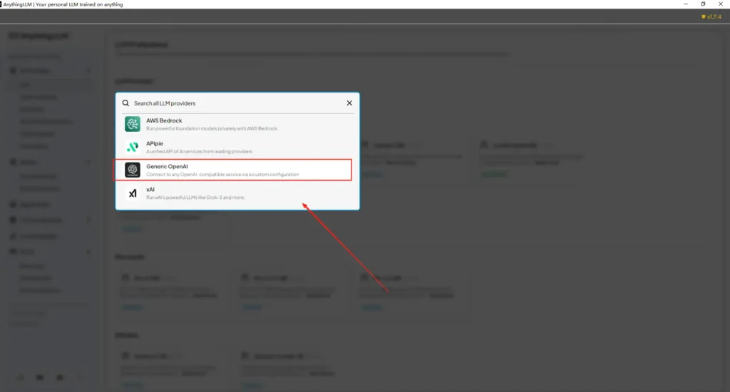 AnythingLLM is an open-source, all-in-one AI application and local/cloud client for building chat assistants, retrieval-augmented generation (RAG) workflows, and LLM-driven agents. It provides a slick UI, a developer API, workspace/agent features, and support for local and cloud LLMs — designed to be private by default and extensible via plugins. AnythingLLM exposes a Generic OpenAI provider that lets it talk to OpenAI-compatible LLM APIs.