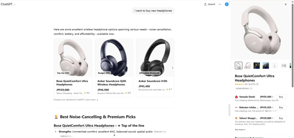 이제 사용자는 검색 엔진에 키워드를 입력하는 대신, ChatGPT에 "100달러 미만 노이즈 캔슬링 기능의 최고의 무선 이어버드를 보여주세요"와 같은 자연어 질문을 하면 이미지, 사양, 가격, 리뷰가 포함된 엄선된 제품 목록을 몇 초 만에 받아볼 수 있습니다. 2025년 XNUMX월 말에 출시된 이 "쇼핑 모드"는 가맹점 카탈로그와 데이터 파트너로부터 직접 실시간 데이터를 수집하여 오래된 목록을 없애고 의사 결정 피로도를 줄여줍니다.