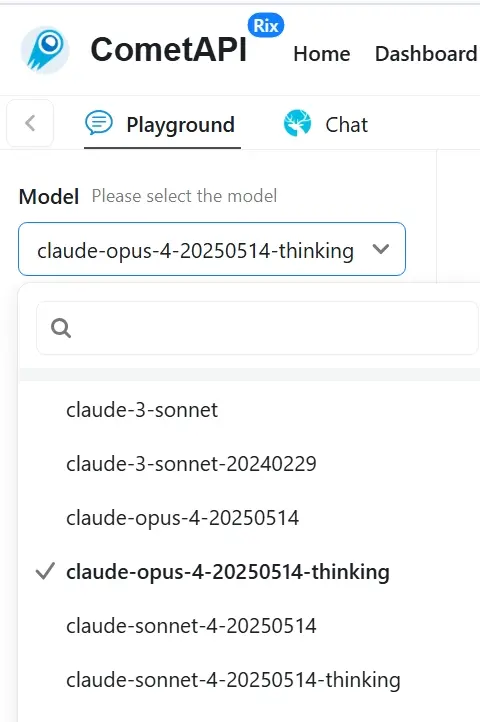 Pembangun boleh mengakses API Claude Sonnet 4 (model: claude-sonnet-4-20250514 ; claude-sonnet-4-20250514-thinking) dan Claude Opus 4 API (model: claude-opus-4-20250514; claude-opus-4-20250514-thinking) dan lain-lain melalui CometAPI. Untuk memulakan, terokai keupayaan model dalam Taman Permainan dan berunding dengan Panduan API untuk arahan terperinci. Sebelum mengakses, sila pastikan anda telah log masuk ke CometAPI dan memperoleh kunci API.