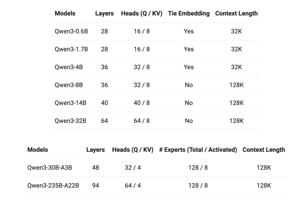 - Model Variants: Qwen 3 offers dense models with 0.6B, 1.7B, 4B, 8B, 14B, and 32B parameters, as well as sparse models with 30B (3B activated parameters) and 235B (22B activated parameters).