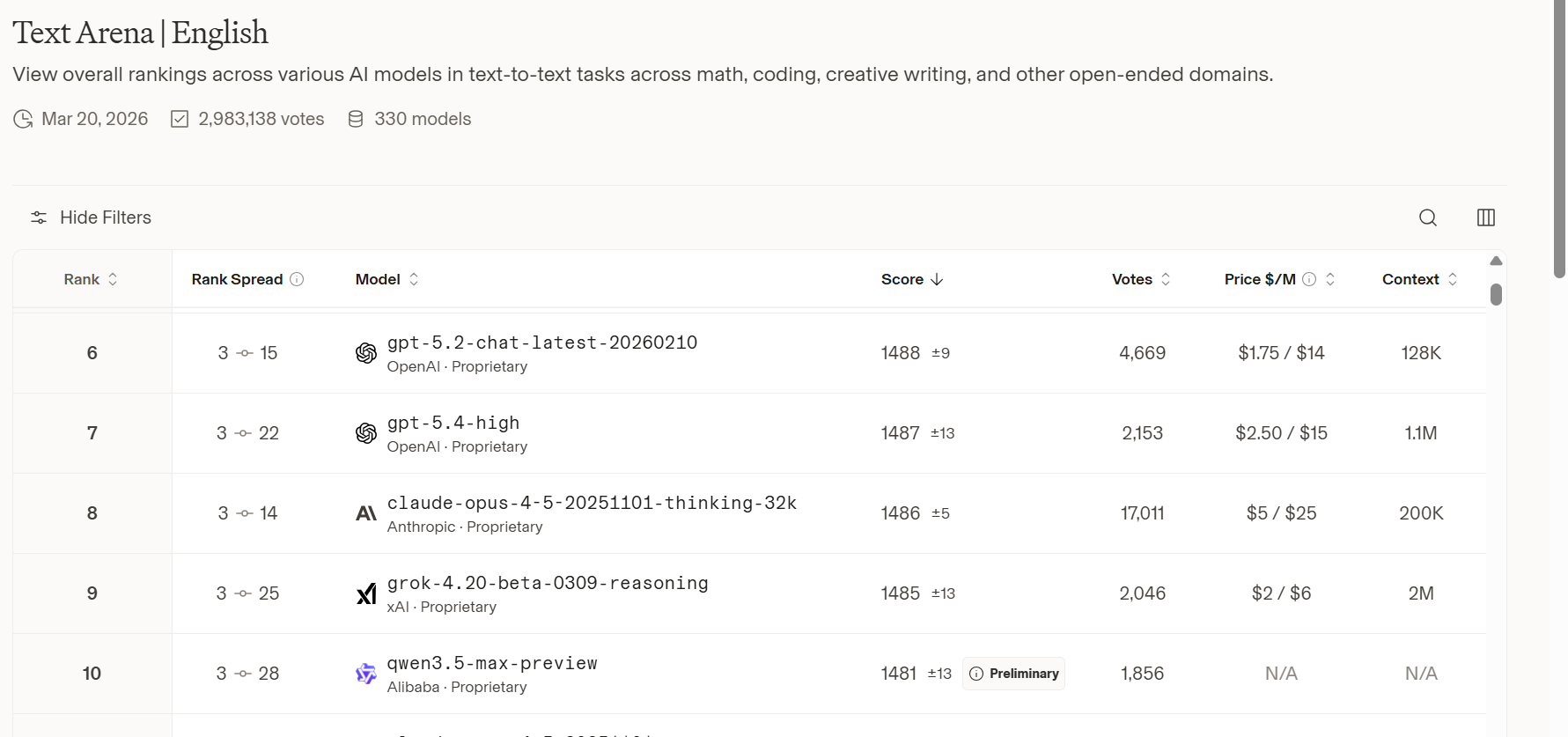 qwen3.5-max-preview was added to the LMArena Text leaderboard on March 19, 2026, according to the leaderboard changelog. In the live leaderboard snapshot, the model is shown with a preliminary score of 1481±13 on the English Text leaderboard, and in the broader Text leaderboard snapshot it appears at 1464±9, again marked preliminary:
