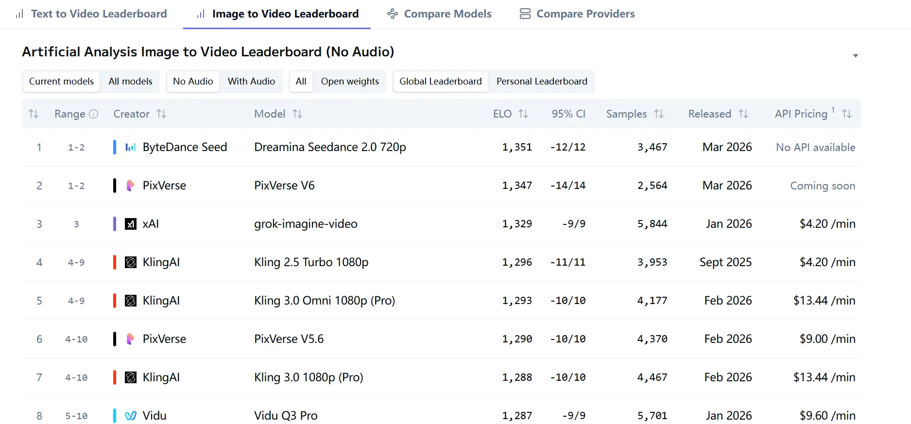 That matters because it means Seedance 2.0 is not only being marketed as capable; it is currently being preferred by users in head-to-head comparison tests on two major arenas. In text-to-video without audio, it leads Kling 3.0 1080p (Pro), SkyReels V4, PixVerse V6, and Kling 3.0 Omni 1080p (Pro). In image-to-video without audio, it narrowly edges PixVerse V6 and grok-imagine-video.